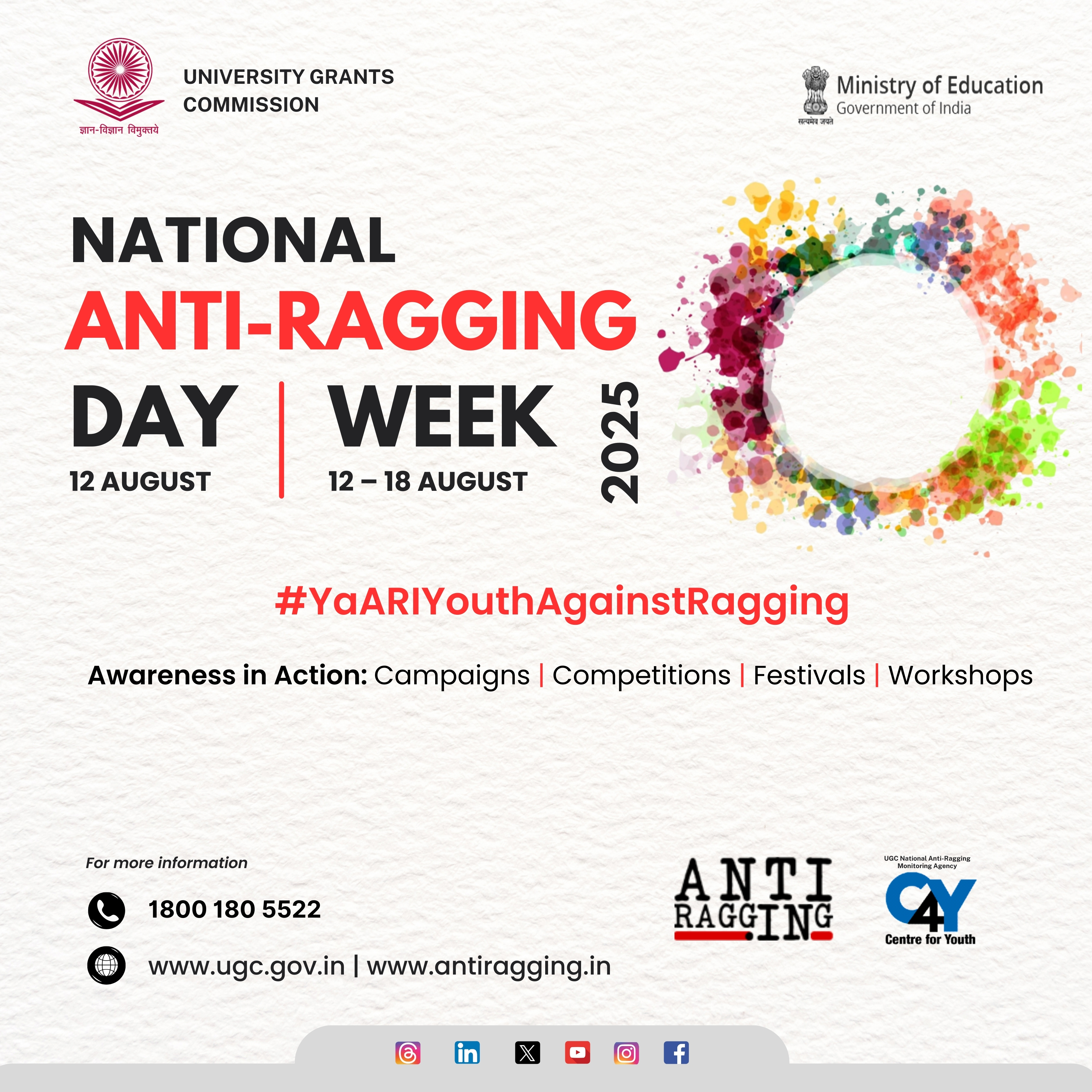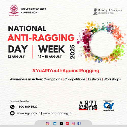 - Use the hashtag #YaARIYouthAgainstRagging in all your awareness activities and social media campaigns & posts related to celebrating Anti-Ragging Day/Week, and tag UGC and C4Y.